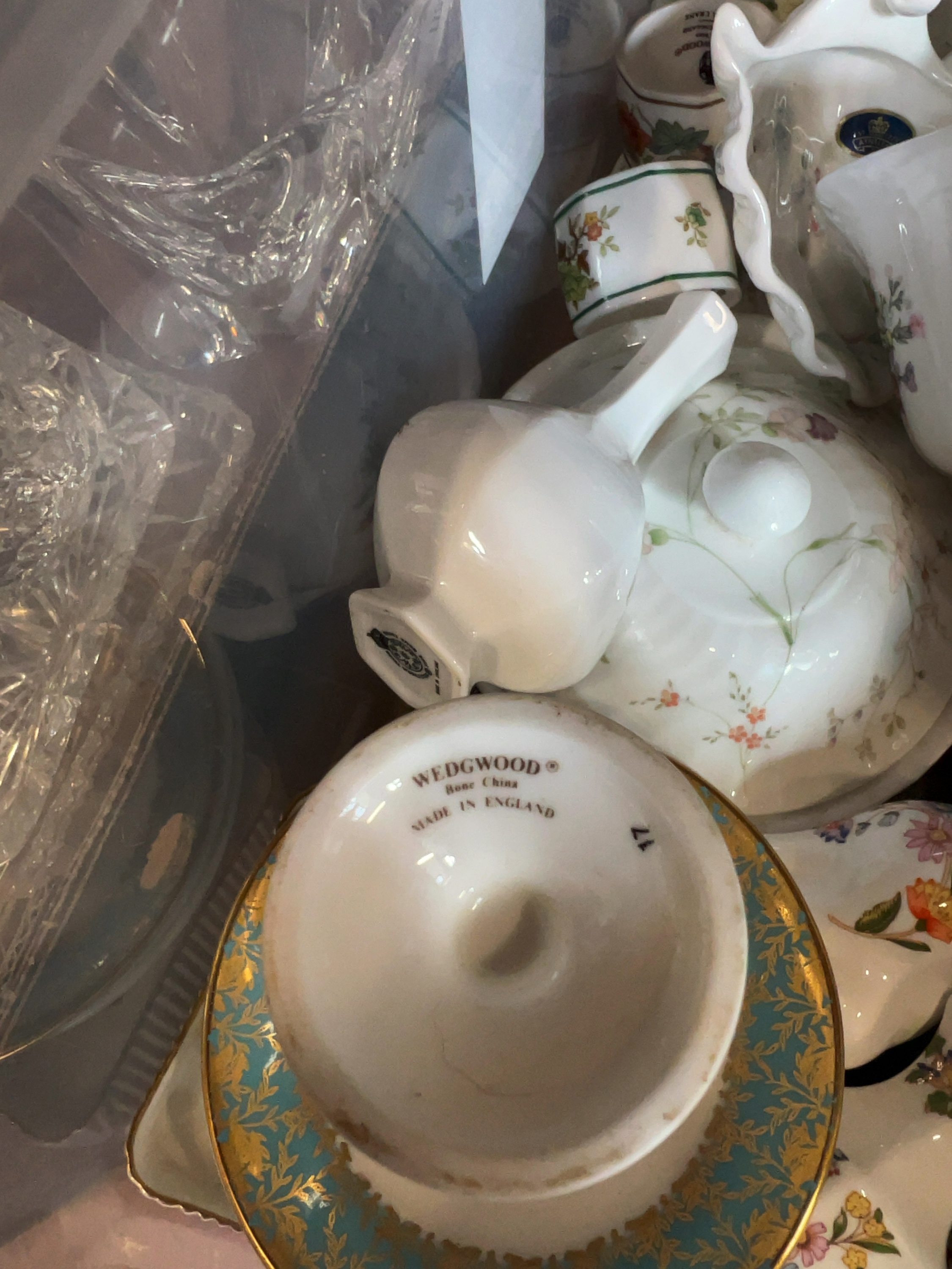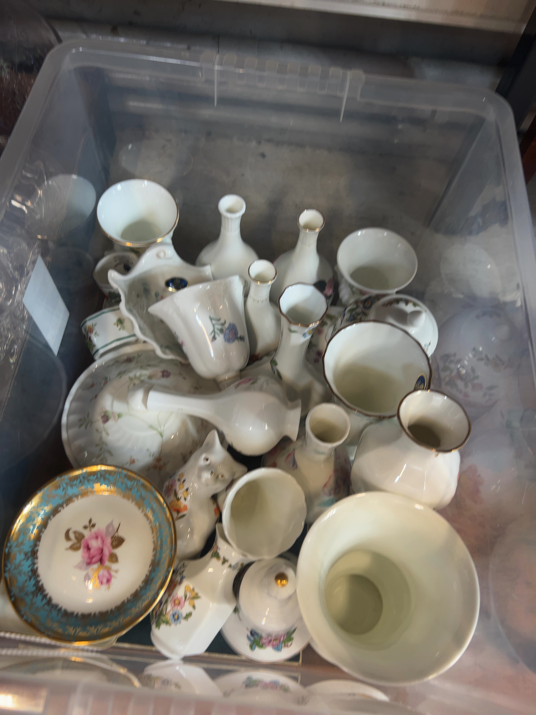 The items are in good overall condition. There is minor surface dust and light rubbing to the gilded accents on some pieces, which is consistent with age and handling. As the items are currently stored together in a container, a piece-by-piece inspection is recommended to identify any potential small chips or hairline cracks not immediately visible.