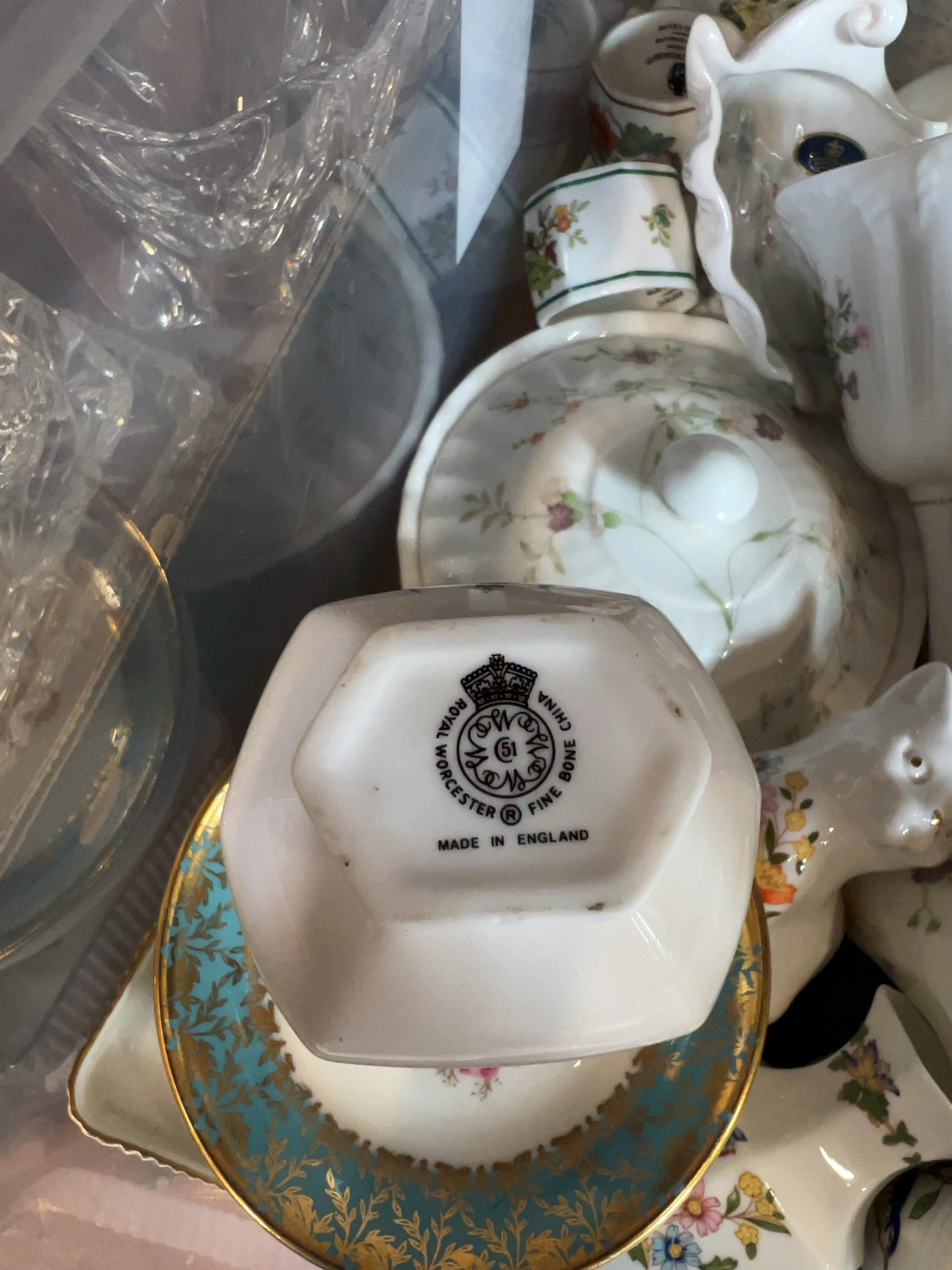 This collection comprises approximately 25-30 pieces of English fine bone china miniature and decorative items. The assortment includes a variety of forms such as bud vases with trumpet and globular necks, egg cups, small creamers, jugs, and saucers. Decorative pieces feature a kitten figurine, a table bell, and small pin or trinket dishes.